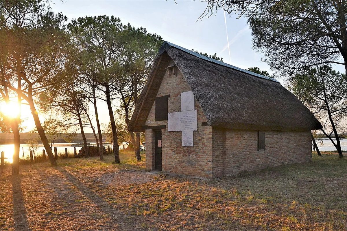 Il 6 agosto 1849, inseguito dall’esercito austriaco, Giuseppe Garibaldi si rifugiava proprio qui dopo aver seppellito sua moglie Anita, morta per gli stenti nella Fattoria Guiccioli. La “Trafila garibaldina”, come fu chiamato l’itinerario che portò in salvo l’“Eroe dei Due Mondi” al di là degli Appennini, ripartì l’indomani da questa piccola costruzione coperta di canne palustri che serviva da riparo ai cacciatori.