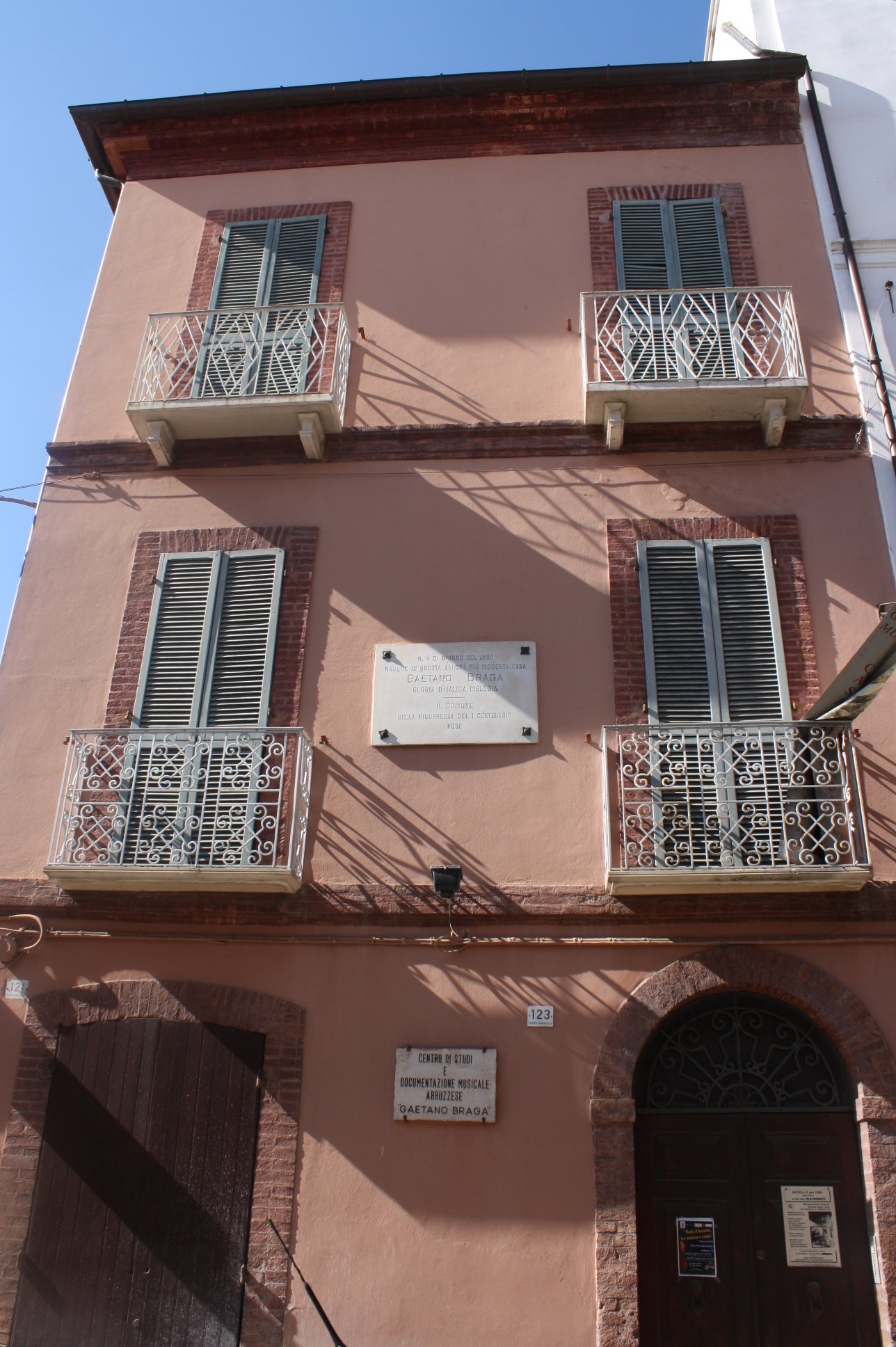 Casa natale di Gaetano Braga. La targa affissa all'esterno recita: «n. 9 di giugno del 1820 | nacque in questa allora più modesta casa | Gaetano Braga | gloria dell'italica melodia | Il Comune | nella ricorrenza del 1° centenario | pose»